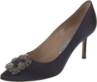 Manolo Blahnik Satin Pumps Blue Pointed-Toes with Crystal Embellishments Includes Dust Bag Fit: This style typically runs narrow and a half size small.