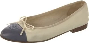 Chanel Leather Ballet Flats Neutrals Interlocking CC Logo Grosgrain & Bow Accents Round-Toes Designer Fit: This style typically runs narrow and a half size to a full size small. Unfortunately, due to restrictions, this item may not be eligible for shipping in all areas.