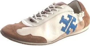 Tory Burch Leather Low Top Sneakers White Colorblock Pattern Round-Toes Lace-Up Closure at Uppers Designer Fit: This designer typically runs true to size. Unfortunately, due to restrictions, this item Read more