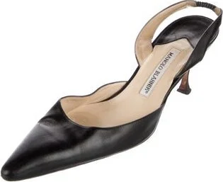 Manolo Blahnik Leather Slingback Pumps Black Semi-Pointed Toes Fit: This style typically runs narrow and a half size small. Unfortunately, due to restrictions, this item may not be eligible for shipping in all areas.