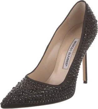 Manolo Blahnik Satin Pumps Black Pointed-Toes with Crystal Embellishments Fit: This style typically runs narrow and a half size small. Read more