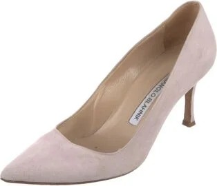 Manolo Blahnik Suede Pumps Pink Leather Trim Pointed-Toes Fit: This style typically runs narrow and a half size small.