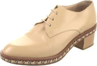 Chanel Leather Mules From the 2014 Collection by Karl Lagerfeld Neutrals Interlocking CC Logo & Chain-Link Accent Round-Toes Lace-Up Closure at Uppers Designer Fit: This style typically runs narrow an Read more
