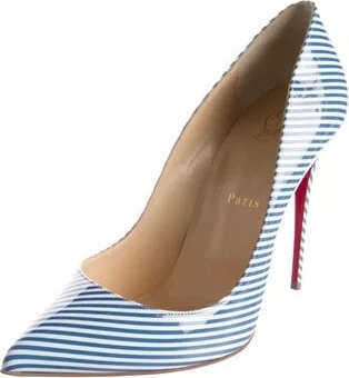 Christian Louboutin Patent Leather Pumps Blue Striped Pointed-Toes Includes Box & Dust Bag Designer Fit: This style typically runs a half size to a full size small.