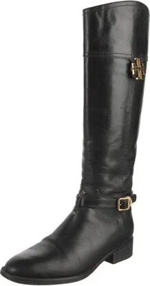 Tory Burch Leather Knee-High Riding Boots Black Round-Toes Wrap-Around Straps Designer Fit: This designer typically runs true to size. Unfortunately, due to restrictions, this item may not be eligible for shipping in all areas.