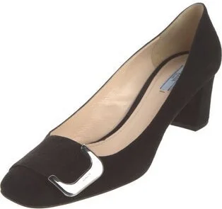 Prada Suede Pumps Black Leather & Metal Trim Square-Toes with Leather Trim Embellishment Designer Fit: Pumps by Prada typically run a half size small.