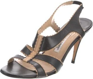 Manolo Blahnik Leather Slingback Sandals Black Scalloped Accent, Rubber & Suede Trim Velcro Closure at Ankles Fit: This style typically runs narrow and a half size small. Unfortunately, due to restrictions, this item may not be eligible for shipping in all areas.